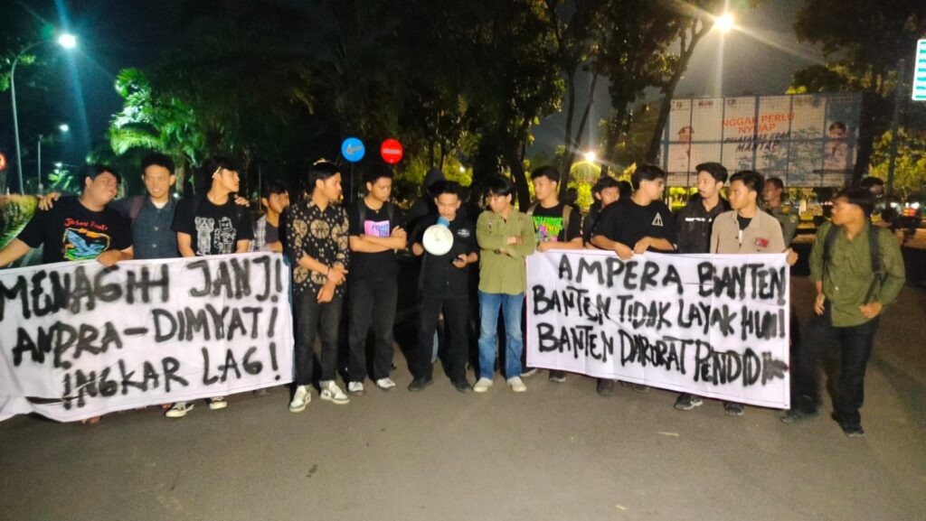 SERANG, BANTENPRO.CO.ID – Aliansi Mahasiswa Pelajar dan Rakyat (Ampera) menggelar aksi demonstrasi di Kawasan Pusat Pemerintahan Provinsi Banten (KP3B) pada Rabu, 9 Juli 2025, pukul 18.10 WIB.