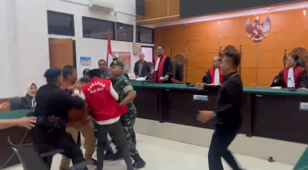 Beruntung, anggota TNI yang bertugas mengamankan jalannya sidang berhasil melerai dan mencegah insiden tersebut. Sidang sempat diskors selama beberapa saat akibat peristiwa ini.