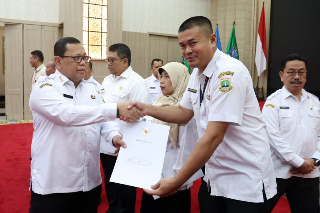 Pj Gubernur Banten A Damenta (kiri) menyerahkan surat tugas kepada Arif Agus Rakhman (kanan) sebagai Plt. Kepala Dinas Komunikasi, Informatika, Statistik dan Persandian Provinsi Banten, di Pendopo Gubernur Banten, KP3B Curug, Kota Serang, Rabu (19/2/2025). (Foto: Biro Adpim Setda Provinsi Banten)
