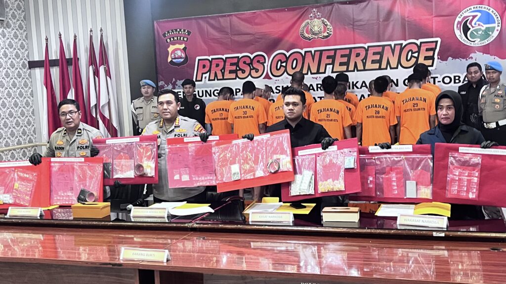 Dalam konferensi pers yang digelar di lobi utama Polresta Serang Kota, Jumat 2 Mei 2025, Kapolresta Serang Kota Kombes Pol Yudha Satria memimpin langsung jalannya rilis didampingi Kasat Narkoba Polresta Serang Kota AKP Dimas Arki Jatipratama. Di hadapan awak media, 17 orang tersangka beserta barang bukti ditampilkan.
