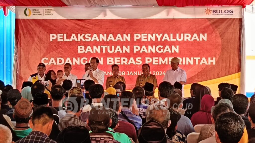 SERANG, BANTENPRO.CO.ID – Presiden Joko Widodo atau Jokowi menyalurkan bantuan pangan Cadangan Beras Pemerintah (CBP) kepada sejumlah Keluarga Penerima Manfaat (KPM) di Kota Serang pada Senin 8 Januari 2024.