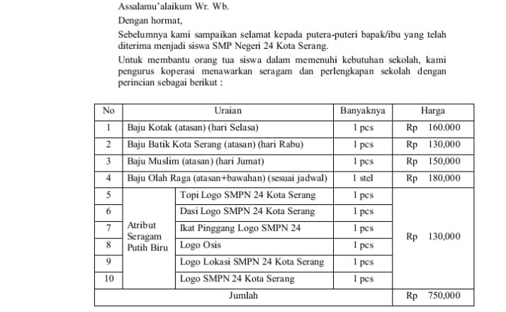 WP menjelaskan, keponakannya hanya membutuhkan seragam olahraga dan batik karena seragam putih-biru dan pramuka sudah tersedia dari bekas kakaknya. Namun, pihak sekolah tetap mengharuskan pembelian semua seragam dalam satu paket.